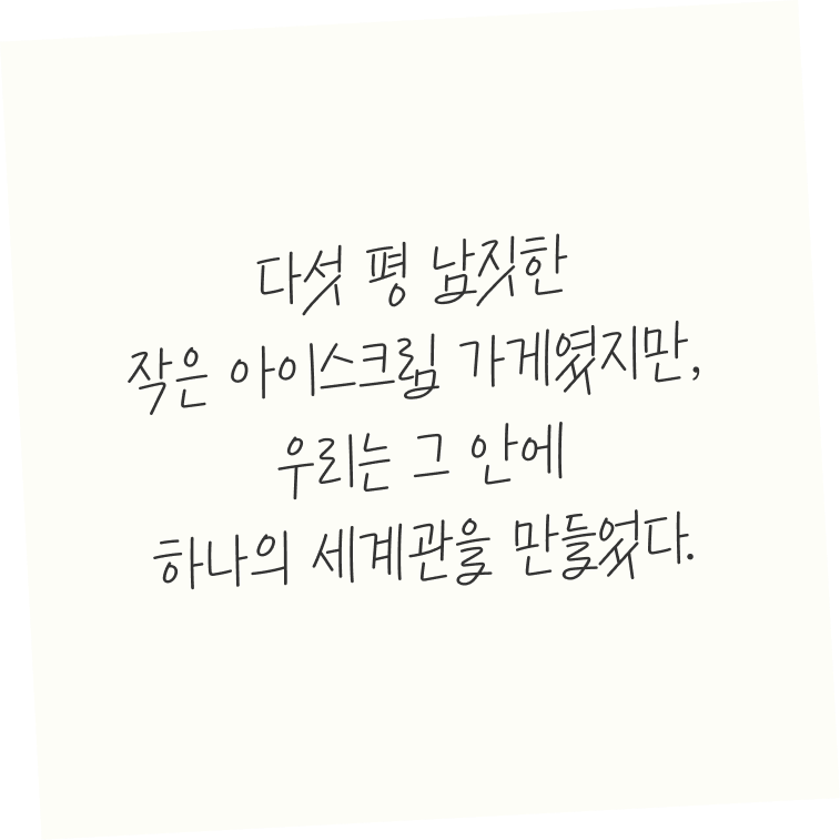 중요한 배움은 손님들에게서도 얻을 수 있었다. 혼자 와서 먹는 아이스크림 한 컵은 자기 자신을 위한 시간이었고, 그 모습은 ‘나로 돌아가는 일’ 그 자체였다. 아이스크림과의 독대를 즐기는 그들을 지켜보며 깨달았다. 부족한 건 정보나 기술이 아니라, 나를 돌아볼 시간이라는 걸.